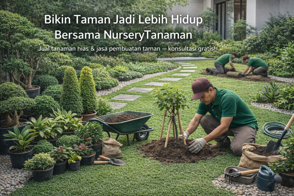 NurseryTanaman melayani pembuatan taman dari nol hingga jadi. Mulai dari survey lokasi, desain, pemilihan tanaman, pemasangan rumput, pengerjaan hardscape, sampai perawatan.