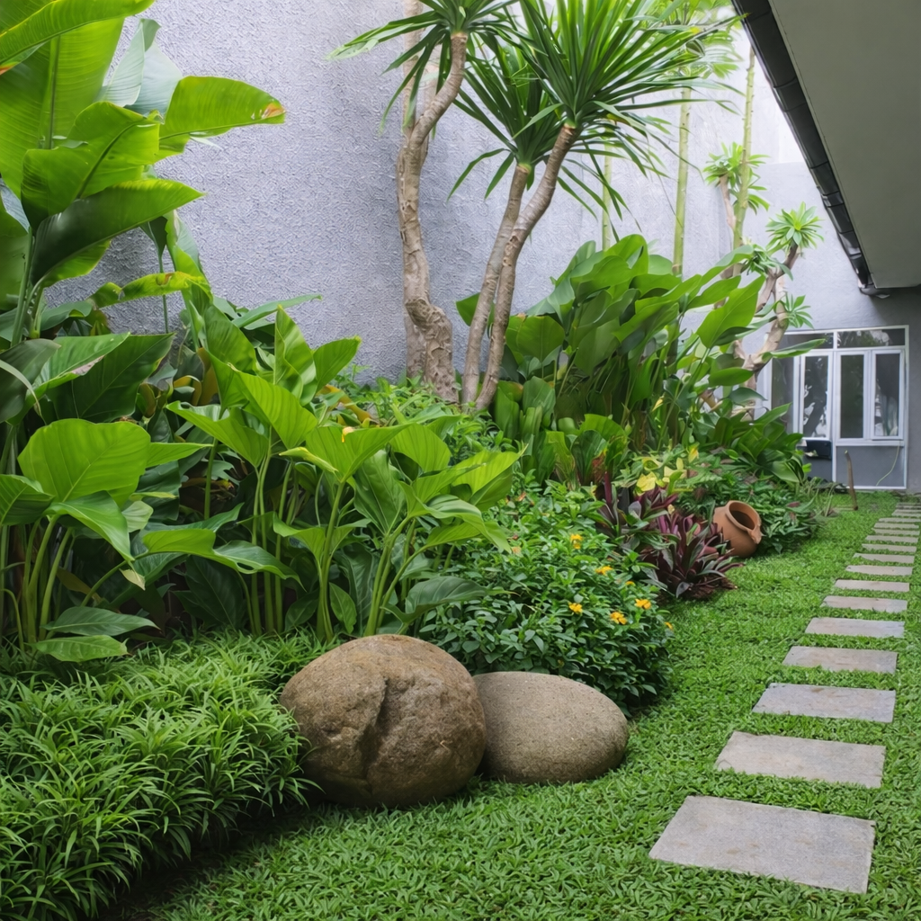 Taman tropis menghadirkan suasana hijau, nuansa alami, sejuk, dan terasa seperti liburan di alam terbuka. Cocok untuk menghadirkan kesan segar di hunian Anda.