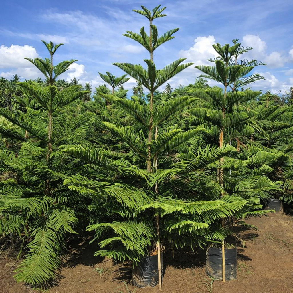 Cemara Norfolk Dengan bentuk bertingkat yang simetris dan tampilan elegan, cemara Norfolk memberi kesan mewah dan rapi pada taman rumah, villa, maupun area komersial.