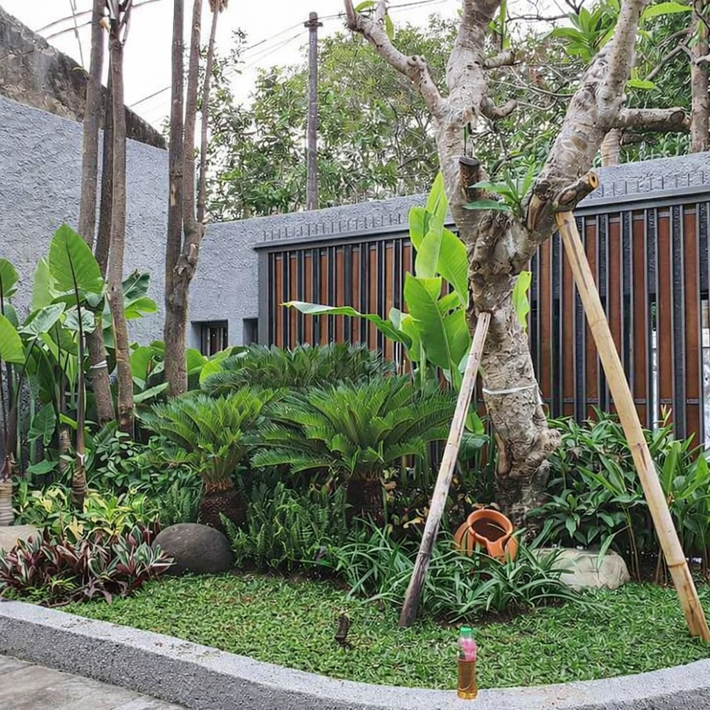 Taman Bali menghadirkan nuansa tropis alami dengan perpaduan tanaman khas, batu alam, dan elemen air untuk menciptakan suasana tenang dan asri.
