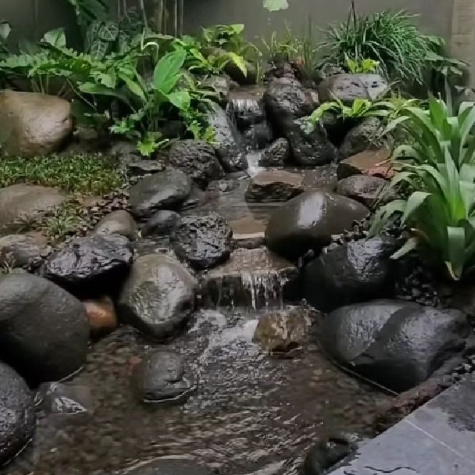 Kolam taman estetik dengan desain natural yang bikin taman terlihat hidup, sejuk, dan nyaman dipandang.