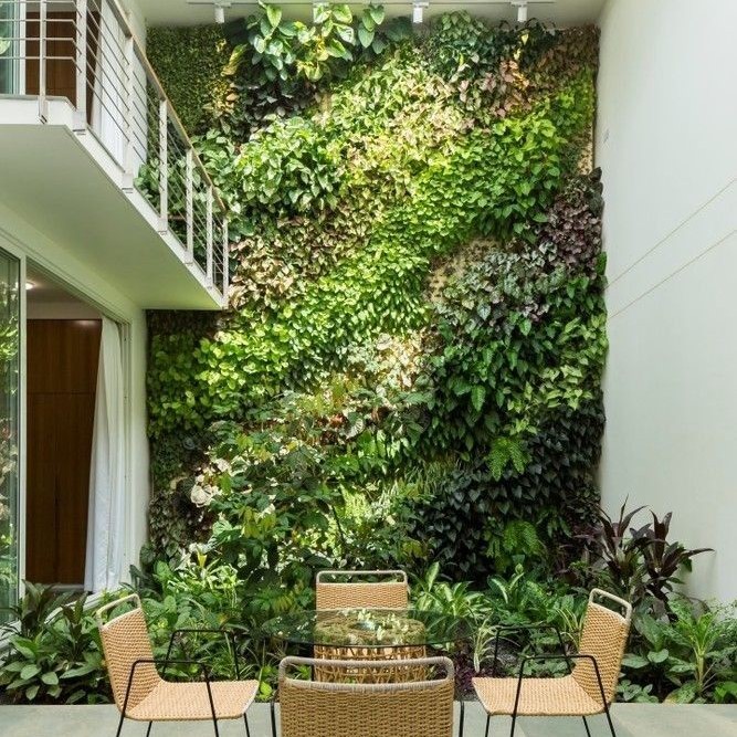 Taman vertikal yang memanfaatkan dinding sebagai media tanam. Cocok untuk lahan sempit, menghadirkan nuansa hijau yang estetik dan hemat ruang.